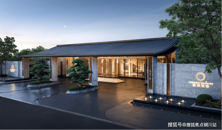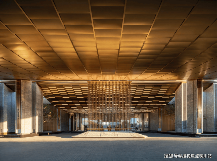 社区主入口“凤起冕旒”,以约85米长的门廊构建出强烈的归家仪式感,材质上融合金属、石材与手工景泰蓝细节,内檐叠瓦与嵌入式光带的设计,使建筑能随自然光景呈现不同氛围。