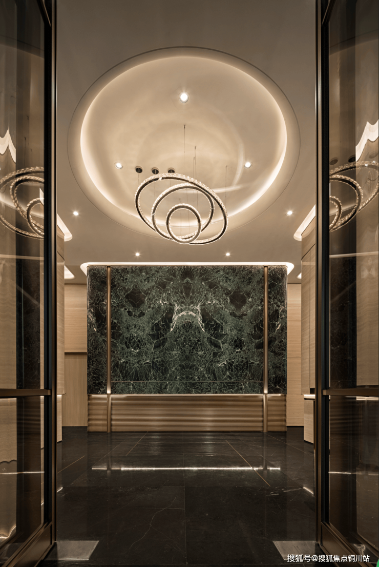 项目住宅打造了奢装入户大堂,单元入户门厅采用超白玻弧线曲面设计,搭配奢石背景墙和线条组合。无论是用材、造型设计还是整体审美质感,都令人叹服。