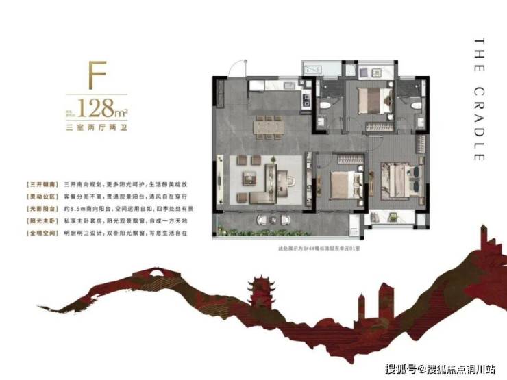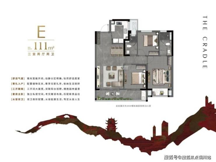 比如,建面约111㎡“舒居型”户型,作为迎龙路顶豪圈唯一的小户型,做到了3房2厅2卫, 3开间朝南,南向配备约6.8米大阳台,得房率超78%(不含赠送),得房率与空间利用率均做到了极致。