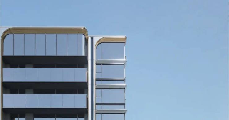 南向立面一水儿平直通透的高透玻璃,形成干净通透的基底,纵向平直的铝板形成框线,顶部是统一的弧线视觉符号,大面积香槟金色铝板弧形顶冠形成拱券的建筑效果,传统美感但是现代质感。金属铝板形成复杂线条,质感与视觉层次极佳。