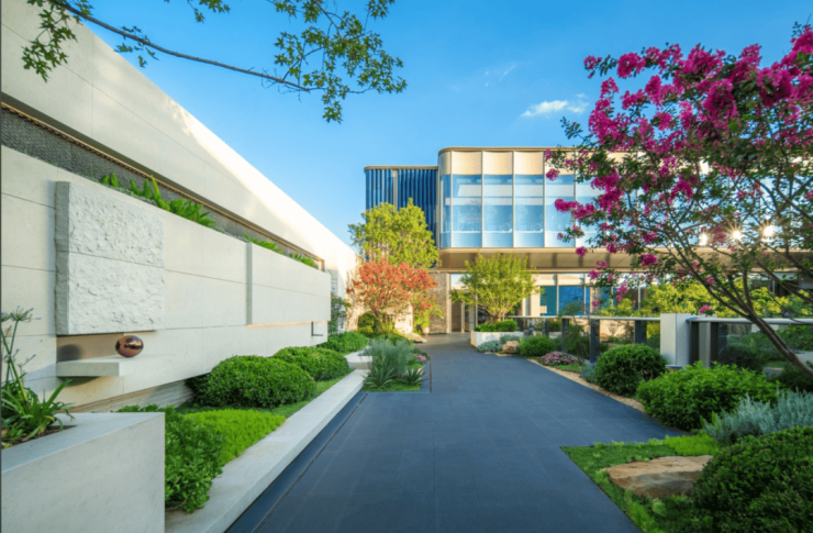 现代景观的元素运用远少于传统欧式景观,视觉感官上简约整洁,整体感很强,风格更精炼。南北轴线交汇的「林间会客厅」地面采用几何式铺装,中央杂植不规则的景观浮岛,自然环境的还原度极强。