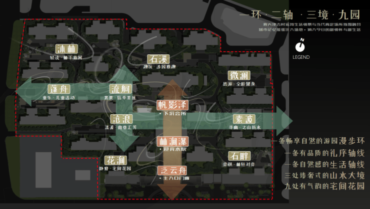 项目整体社区体量巨大,有充足的空间营造景观体系,一条环形景观带,串联两条景观轴与9个组团。南北景观轴以主入口为核心南北贯通,串联起入口前场、酒店式入户大堂、下沉庭院与内部景观庭院四重空间,以气势与功能性见长。东西向轴线是以东侧次入口为起点,大面积种植绿岛与蜿蜒的人行步道,形成林下景观带与丰富的社交场所,满足社区景观的实用性需求。