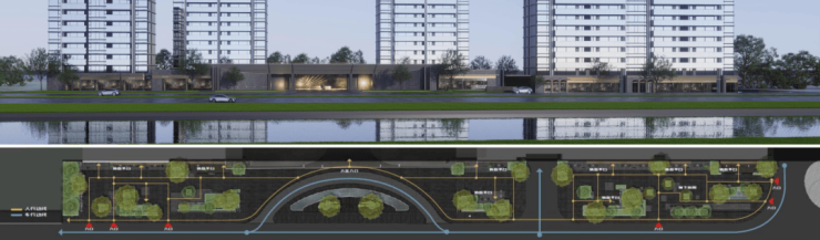 人视高度从南侧看过去,整个社区的商业、门头、出入口连贯起来,是一个超过220米的现代感城市界面,前场宏大的社区大堂,背景是玻璃体为主的建筑背景高低错落。