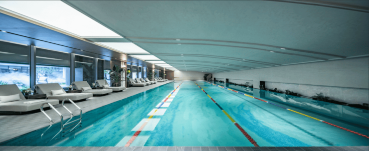 ▲天津金茂府现代景观手法与会所泳池实景图
