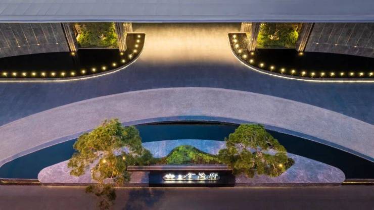 石材底座构筑的酒店式落客中岛,两颗造型松倾斜角度都经过精准测算,底部水系映衬形成巨型盆景效果。顶部是大面积金色铝板出挑,气势磅礴。入口两侧石材景强向两侧延伸,交接处用古铜色金属线条做勾勒,精致感拉满。中央景墙是一面高度约4.9米,宽近14米的波纹处理液态大理石,形成整个入口底景。垂直高度与进深空间的层次细节拉满。