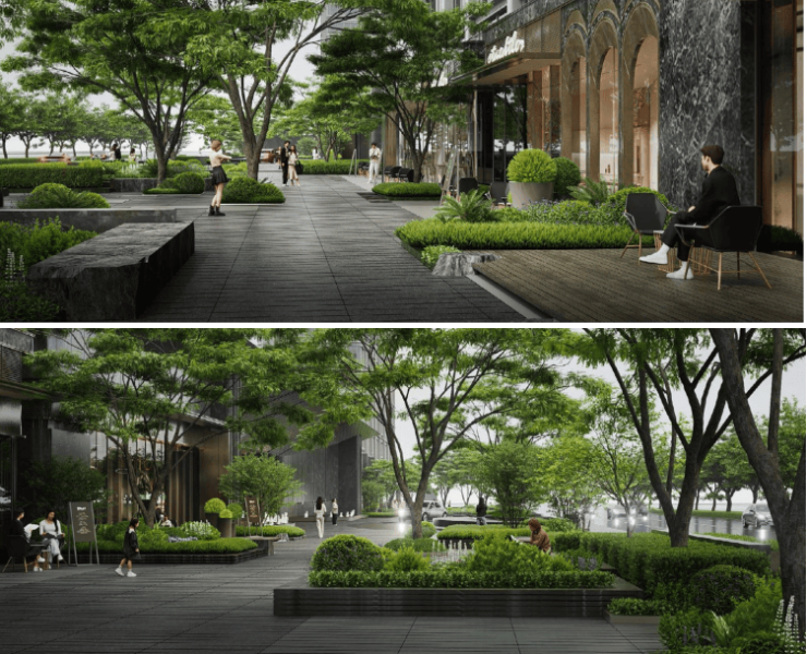 项目南临大运河小环境极佳,为了匹配客户对品质感城市界面的诉求,市政人行道路面大面积提升,同时将城市街角花园重新设计,丛植植被与树池形成缓冲退隐处理,为人行步道创造停留场所。社区一侧是沿街商业,玻璃落地窗商业门头形成橱窗效果。业主可以在商业前场咖啡吧消费也可以树下林间休憩,整体是惬意轻松的城市烟火气。