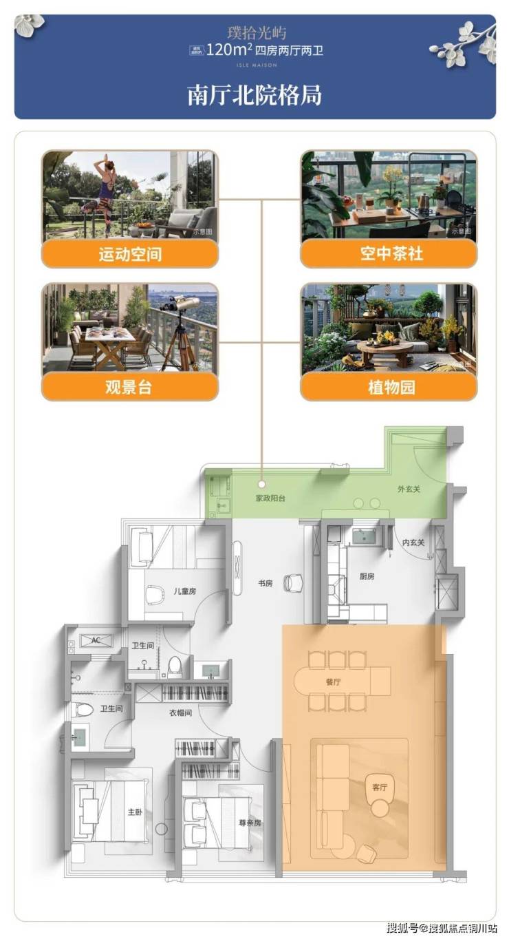 璞拾光屿建面约120㎡户型在建面约100㎡户型的优秀基底上,实现了“全能居住”到“奢享从容”的升级。不仅拓展北向阳台尺度,更是以奢阔的四房格局装载多代家庭的生活理想。