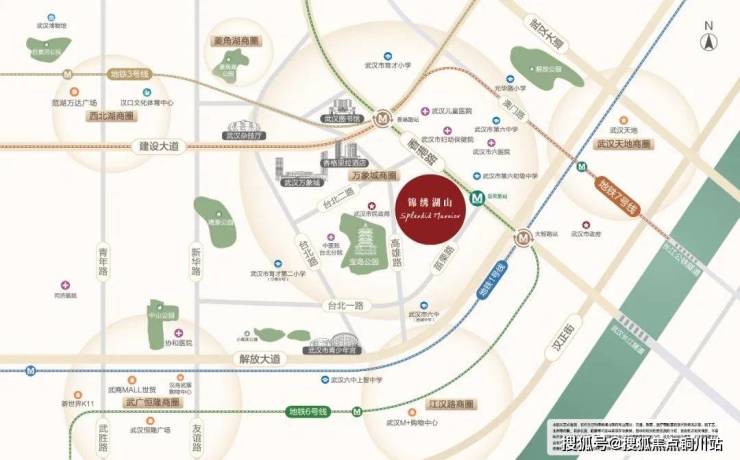 地理位置优越:万科锦绣湖山位于武汉金融街与台北路结合处,高雄路 86 号,紧邻宝岛公园,与万象城仅一街之隔。周边交通便捷,地铁 6 号线苗栗路站仅 300 米,3/6/7 号线香港路站也在 600 米范围内,3 公里内覆盖西北湖、花园道等多个商圈。