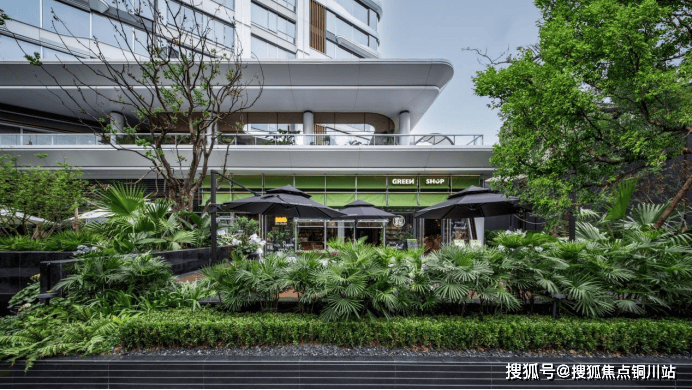 V 字门头与商业街:项目拥有宽约 26 米、高约 9 米的双曲面设计独特 V 字门头,气势恢宏而华丽,成为汉口豪宅的标志性符号。右侧百米长的度假风商业街,引入 GREEN SHOP 品牌店,20 多种绿植花卉与高大乌桕相互穿插,营造出隐奢的口袋花园,让业主回家的路成为一场惬意的 citywalk。