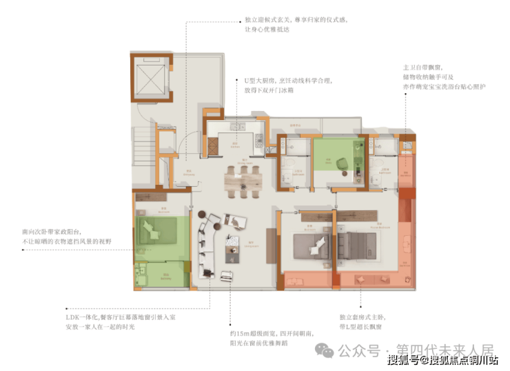 类一梯一户设计,搭配270°自然采光的独立电梯厅,带来如豪宅入户花园般的私享体验;进门独立迎候式玄关,更是将归家的尊享仪式感,拉高了一个Level。约15米奢阔面宽,超尺度的四开间朝南,让家中沐阳指数满级。