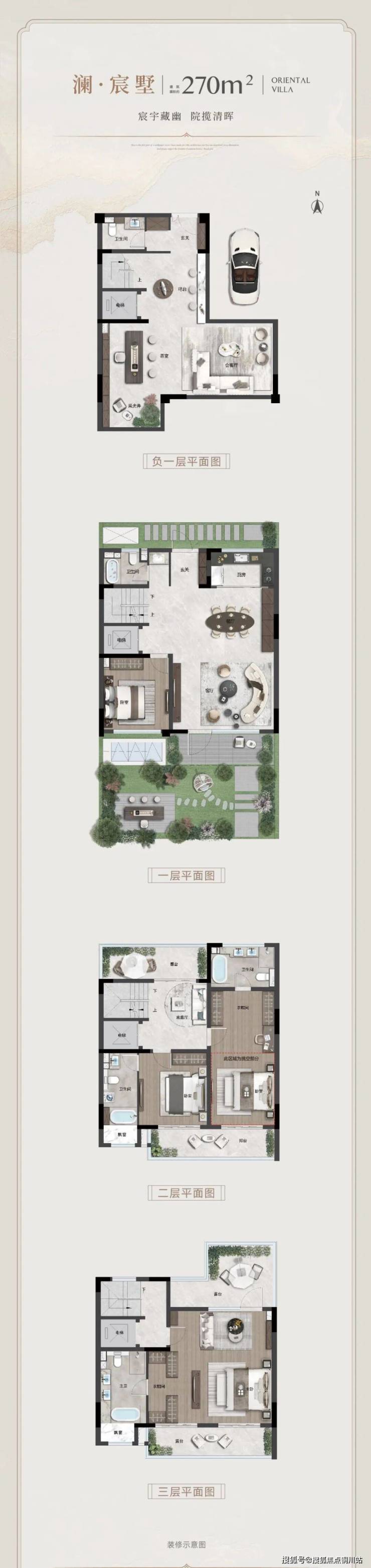 以约270㎡为例,地上三层,带南北双庭院+全屋4个露台/阳台;客厅挑高高赠送,二楼是家庭客厅+朝南双套房,三楼是整层套房,尺度颠覆!