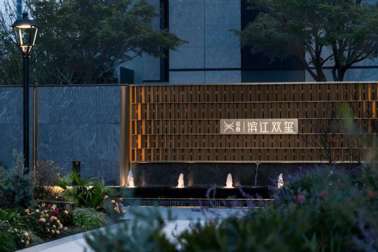 第一眼度假酒店式落客区,奢阔门头以艺术墙体结合金属嵌条、迎宾水景、灯光等营造高奢质感,予业主归家的仪式感、秩序感和身份感。
