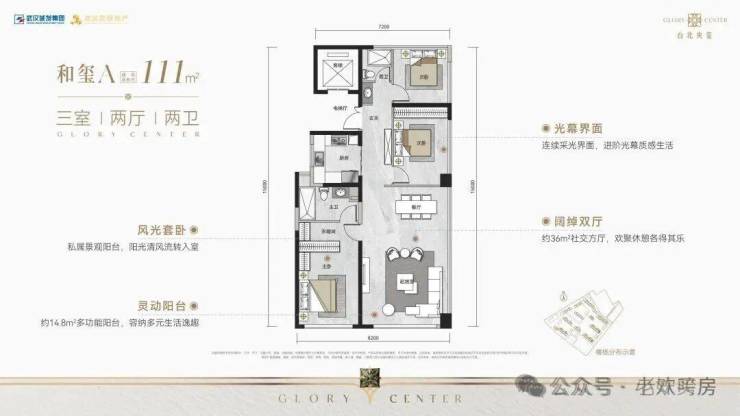 建面约111㎡三房两厅两卫,南北通透的边户,南向两开间,三面采光,南北双阳台,带独立电梯前室,拓展空间充足,客厅双面窗,采光视野不错。