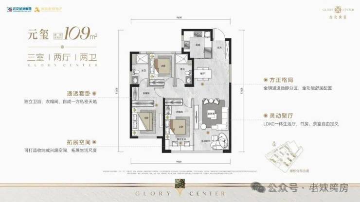 建面约109㎡三房两厅两卫,紧凑改善户型,中间户,南向面宽优越,布局方正,动静分区合理,独立阳台可拓展,满足三口之家日常居住需求。