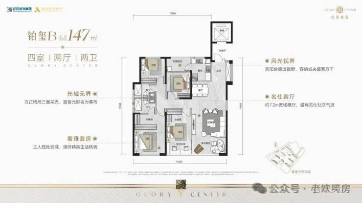 建面约147㎡四房两厅两卫,南北通透的边户,格局方正,三开间朝南,四房设计,南北双阳台,功能性强;客厅可作横厅设计,整体空间利用率高。