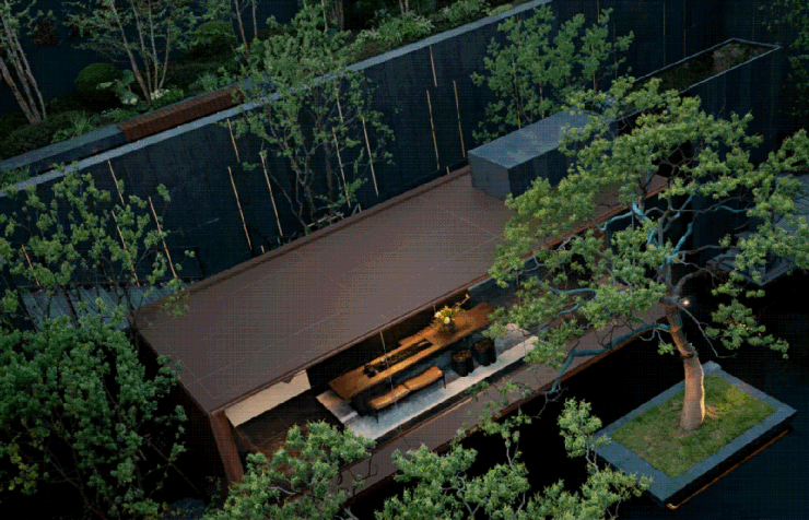 同时在会所外打造无锡罕见的三沉浸式会客区——约600㎡下沉式庭院+二楼星空露台+悬浮茶室。