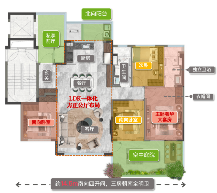 约14.5米的南向大面宽,采光面出众。其中,约20㎡的南向空中庭院及北向阳台为全赠送,仅此一项便创造了可观的附加价值。