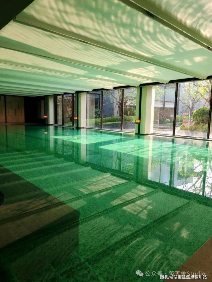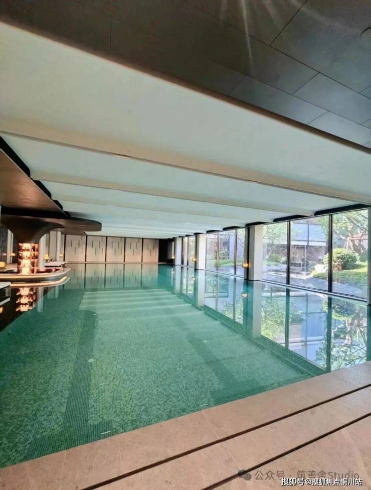 南京首个悬浮吧台恒温泳池,融合标准四泳道、步入式台阶与无界庭院视野,搭配玻利维亚蓝奢石背景墙与哑光毛面石材墙面,尽显低调奢华。这个悬浮吧台还是很有创意,非常出片哟。