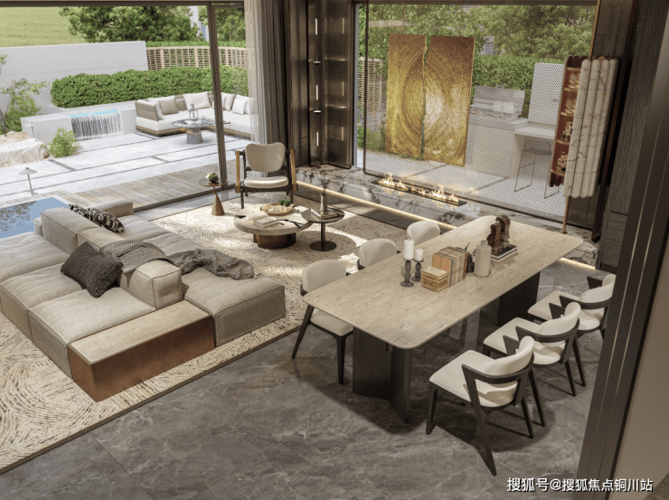 再加上约270°环幕落地窗,带来更大活动空间、更大采光面、更大视野景观,让外部庭院景观,成为了室内的“风景画”,实现了内外之美的无界交融。
