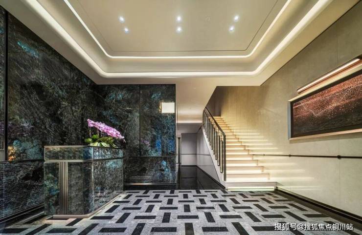 更大手笔的是,入户大堂的楼梯台阶通铺文斯白大理石,侧面还有隐藏灯带,老钱风满满。