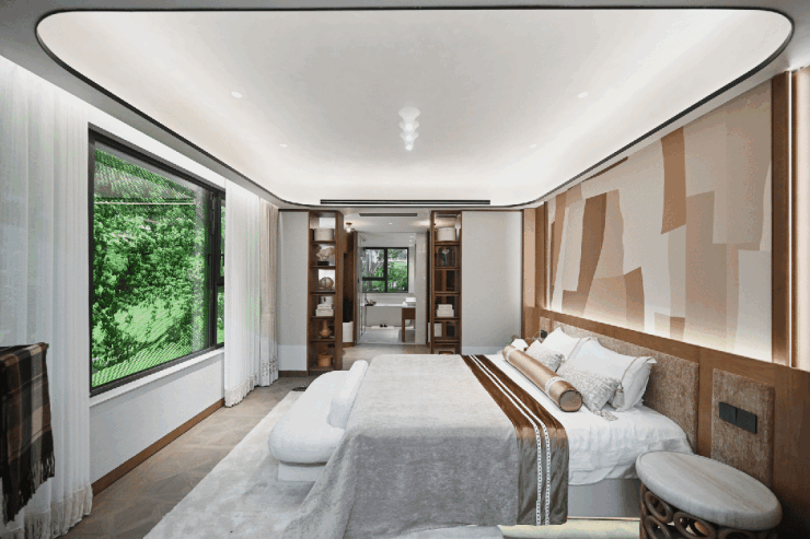 多套房设计,让老人有自己的领地,不用和孩子挤在一起。其中160㎡主卧更是做成了十字中轴总统套房,双开门+270°观景视野起居室+双台盆洗手间+步入式衣帽间。