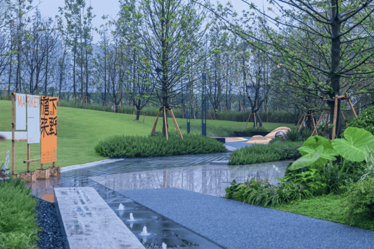 丰富的景观空间:万科檐语间的景观设计以 “两轴、双心” 为框架,打造出了一个充满活力与温情的全龄友好社区。与两个社区主入口相接的两条礼序归家轴,串联起了社区的各个功能区域;南北两个漫生活中心区,北侧以成年人为主,设置了轻氧健身盒子和棋牌茶室盒子,南侧则以儿童活力为主,包括童玩盒子和儿童学习盒子。