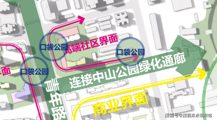 贯通的绿化带与多点放置的口袋公园及公共绿化空间;