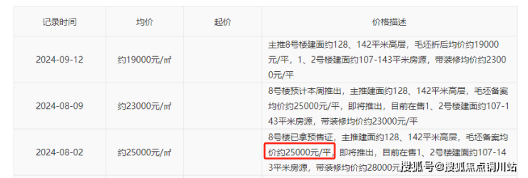 2024年8月1日8号楼取证,变成了毛坯销售,备案均价25000元/平,相比上一期下降了6000元/平,降幅达19%。