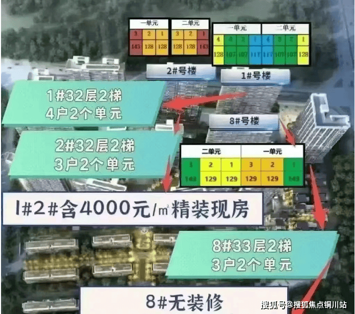 当前在售的1、2、8号楼共计5个户型,分别为建面约107、117、128、129、143平五个户型合同公摊22%,算上飘窗优化和阳台赠送后的实际得房率在83.5%-85%,具体房源分布如下图: