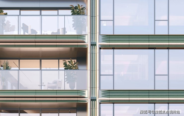 标志性的曲面屏设计通过取消转角结构柱,实现270°观景视野,达成视觉的无界延伸。大面积绿色陶板材质的运用,以其比铝板更丰富的光影、比石材更灵动的质感,与香槟金线条共构出立面的温度与深度。