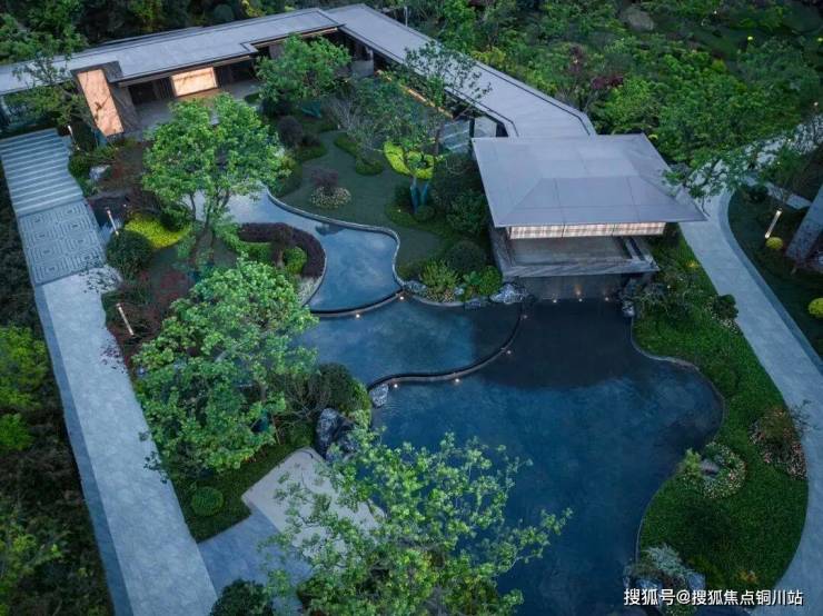 室外的下沉式庭院种植着罗汉松,搭配奢石景墙,营造出沉浸式的雅奢体验。