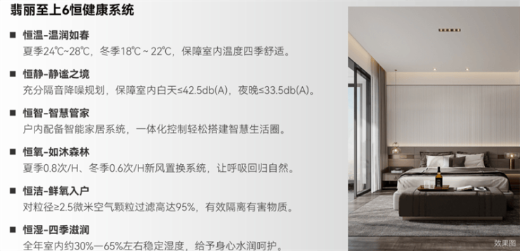 在“恒温、恒静、恒氧、恒洁、恒湿、恒智”的量化下,从温度、湿度、空气、声音等多个方面关注人们的健康问题,感知真正的智慧健康科技带给居住的幸福体验。