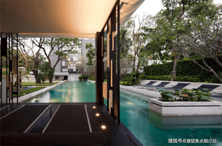 二进度假中轴,综合东南亚度假风泳池和中式禅意台地花园,在浓郁的度假氛围中,示范水畔的闲适;