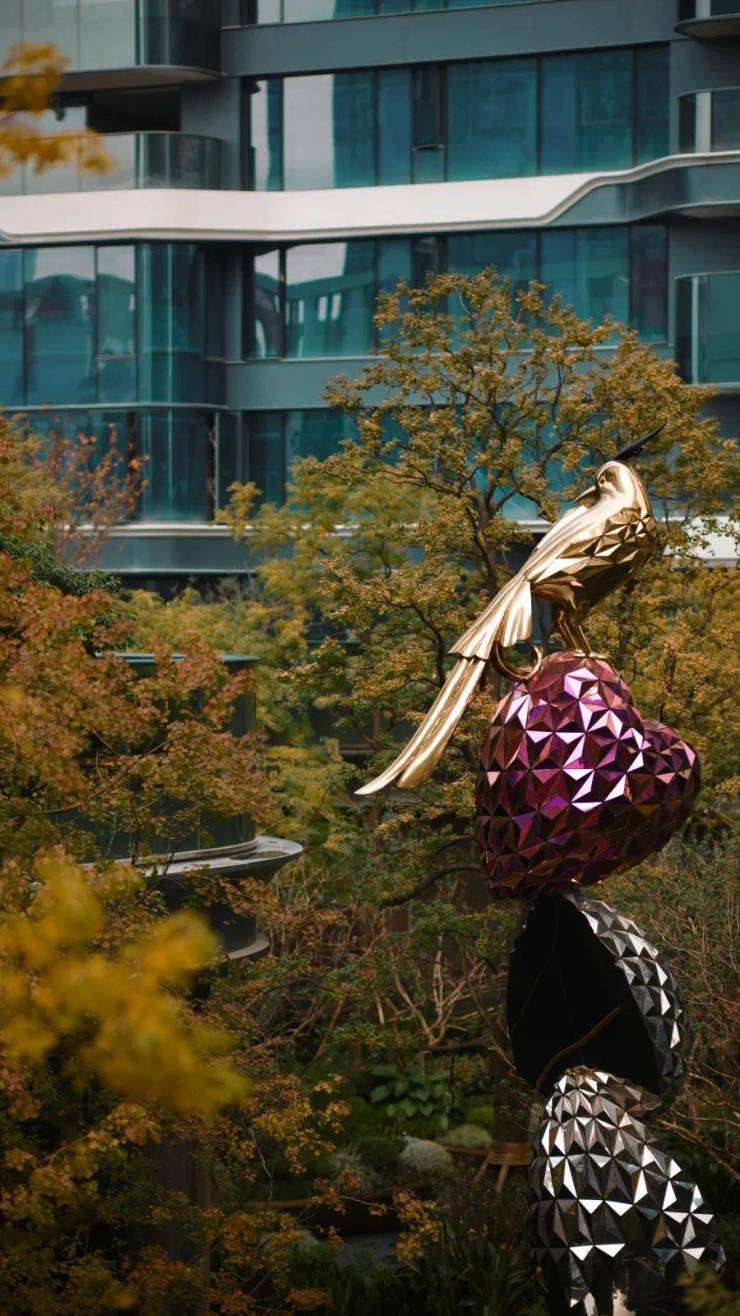 尤其值得称道的是,悬浮其间的"永恒之心"艺术雕塑以心为形、祥鸟为首,堪称神来之笔,由20名匠人团队耗费400小时、6道手工工艺精雕细琢,在丛林中若隐若现,将自然意趣与人文匠心通过重工奢材传递品质感。