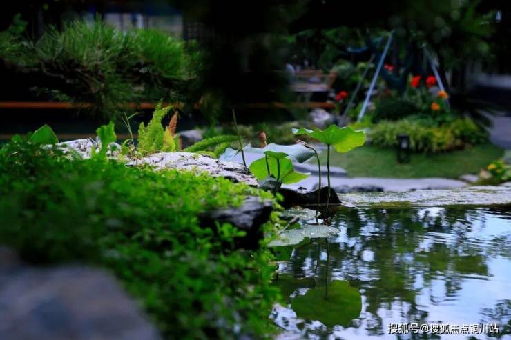 锦鲤池结合净化系统设计,水中锦鲤游弋,与置石、植被相映成趣。深池倒影之中,建筑轮廓朦胧可见,动静之间,情趣盎然。