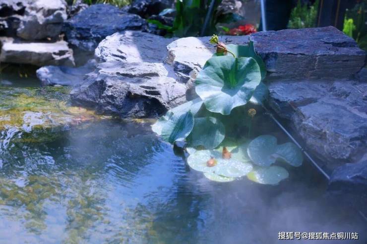 中央水庭为整个景观的视觉中心,采用英德石堆叠打造驳岸,配合叠瀑与跌水设计,构筑出动态灵动的水景。观水堂与藕园榭隔水相望,倒影如画,飞桥与汀步引导人们沉浸式感受空间层次之美;沿水景动线,雾森系统营造出仙境缥缈。