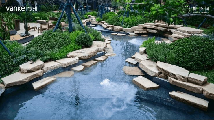 比如门庭“回字纹”弹石地面,由工匠耗时三天三夜手工拼就,经不得半点疏忽;浅滩溯溪的每块溪石均经精细打磨,确保圆润无棱角,孩子赤脚玩耍更安全;锦鲤池底更暗藏匠心——松木桩基+抗渗混凝土整体浇筑 ,万科严苛的工艺标准尽显于细微之处。
