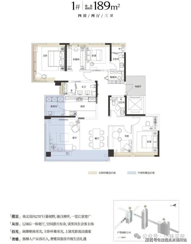 1号、2号楼东侧靠近和平大道为149平户型,西侧3-15层为153㎡;16层及以上为189㎡看江房源;3号楼为146㎡、153㎡和189㎡户型组合。