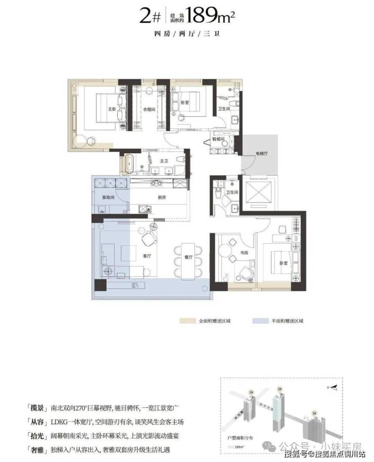 ③南北双向大视野,推测其采光面更宽、有更好的景观视野。高区房源有不错的江景效果,根据不同楼层的视野示意视频已制作,有兴趣欢迎索要。