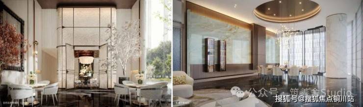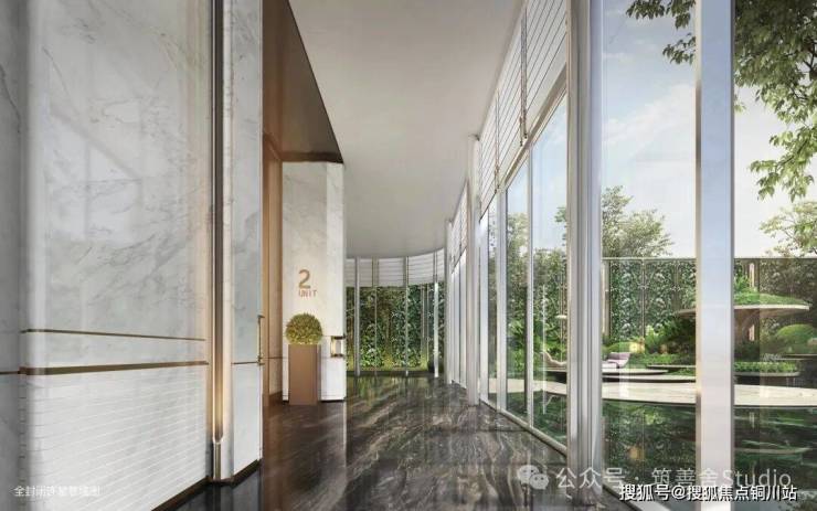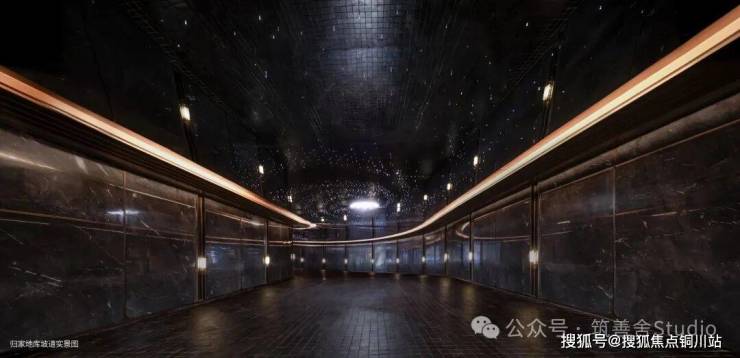 社区主入口横向展开面长达百米、高6米,参考酒店式入户设计,布置环岛落客区奢侈空间尺度。范思哲黑与安哥拉黑石材低调华贵,顶面千片鳞片造型似江浪灵动,百达翡翠原石与黄铜镶嵌而成“王冠之瞳”,整体空间奢华与优雅并存。