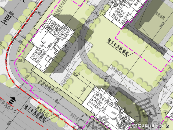 从总平图来看,1号楼和7号楼的间距为29米,3号楼和4号楼也只有30.8米,5号楼和6号楼的间距是24米。