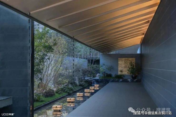 延续大门的低垂披檐,庭院中的茶亭采用「瘦金披檐」,而檐下隐蔽式光源,渲染出高级浪漫的氛围,静默伫立成为一座链接文脉与生活的灯塔。
