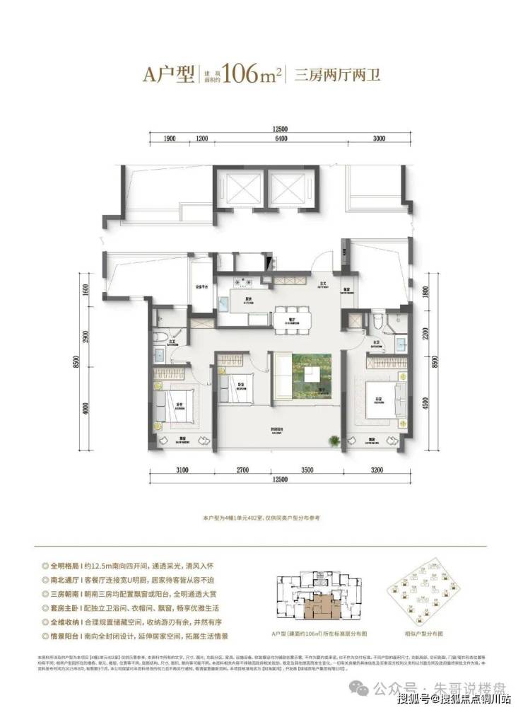 106㎡实现四开间朝南,南向面宽达12.5米。