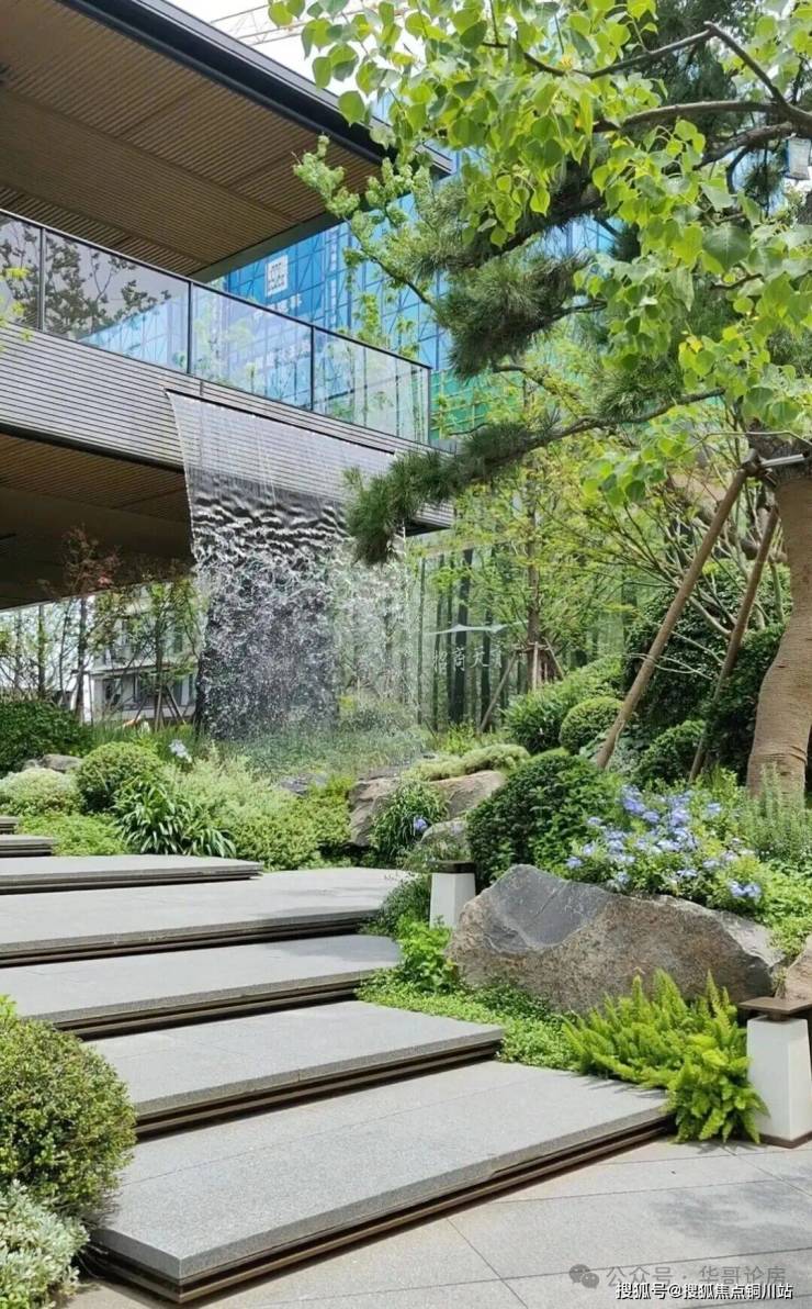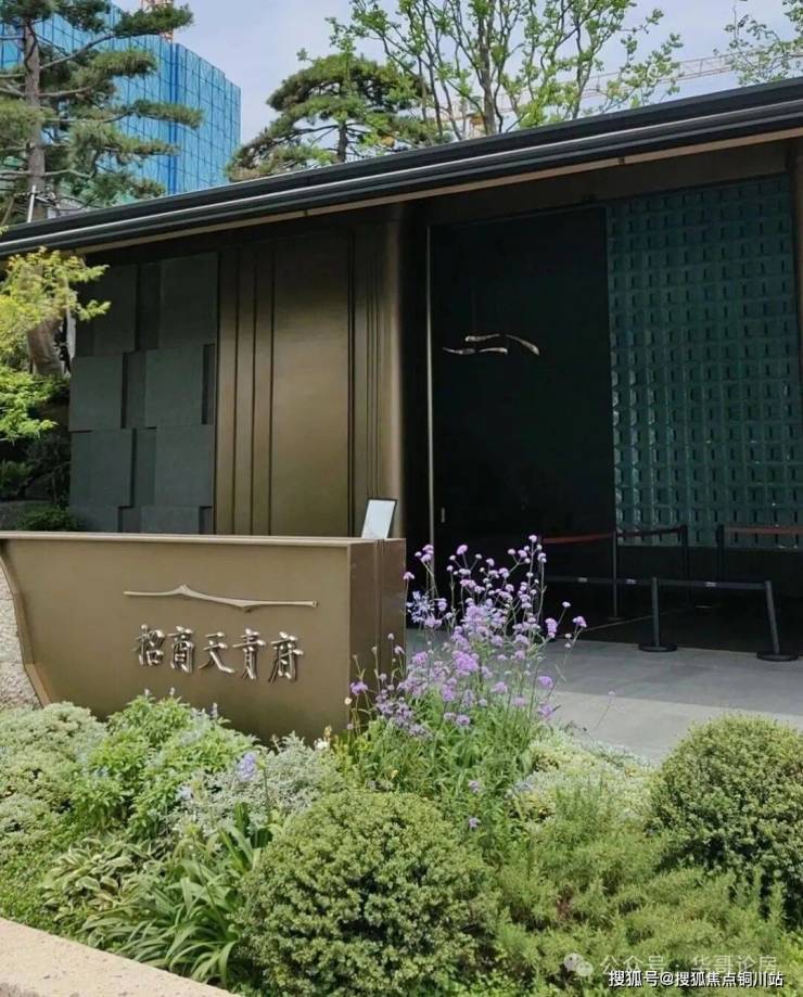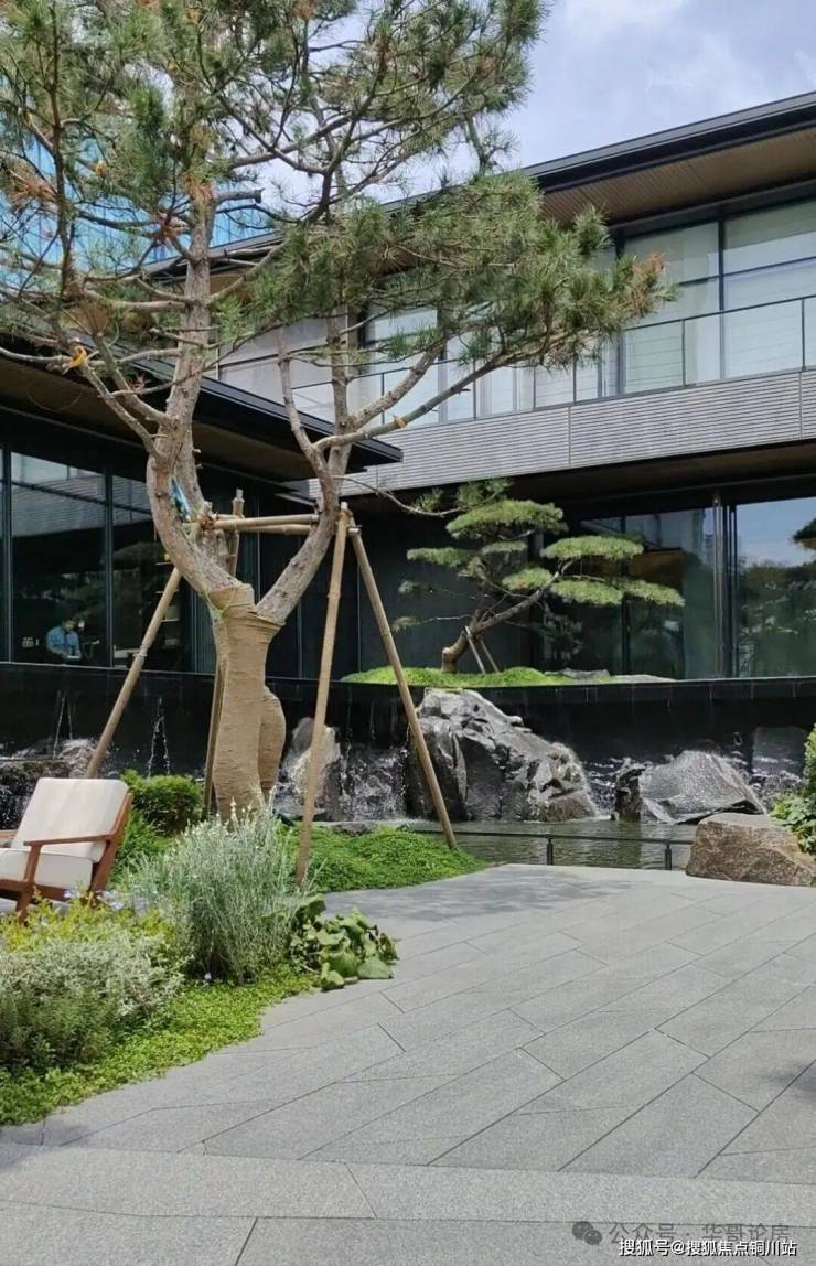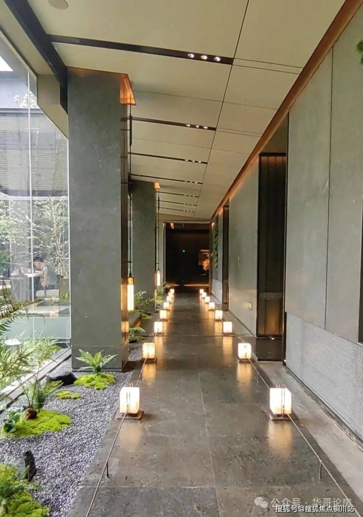 步入门廊,两侧是天青瓷铺就的景墙,入口的园林种植了18棵油松,加上灵动的水景,步行其中颇有曲径通幽之感。