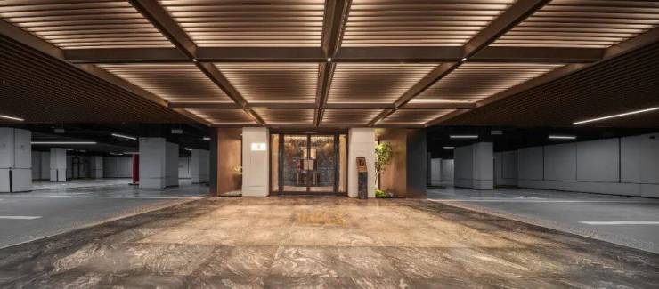 追求星级酒店审美的,还有公区。媲美丽思卡尔顿酒店的车马厅,顶部藻井格栅、地面天然石材铺装、透光云石楼栋标识、云石单元门把手的运用,加上天地墙一体化设计,每一次归家都是视觉与体验的双重享受。