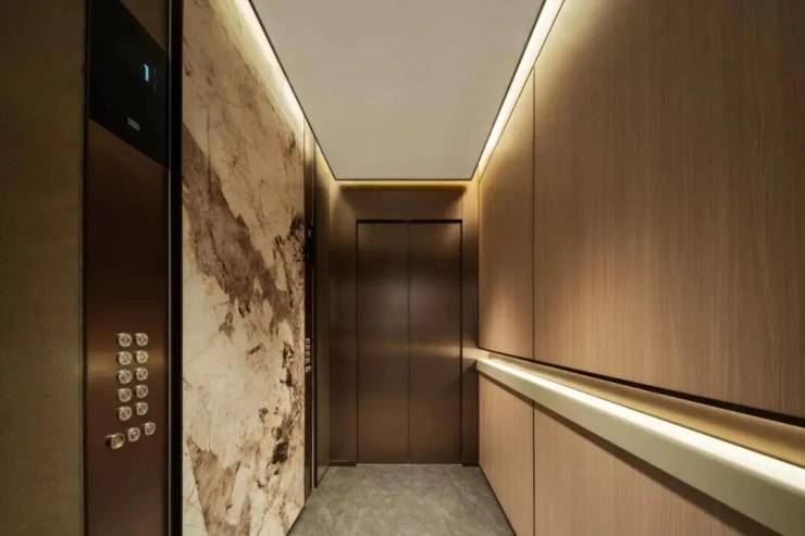 走进电梯,是同样的酒店质感。皮革、岩板、木饰面、金属的艺术运用,让整个轿厢空间质感更强了。