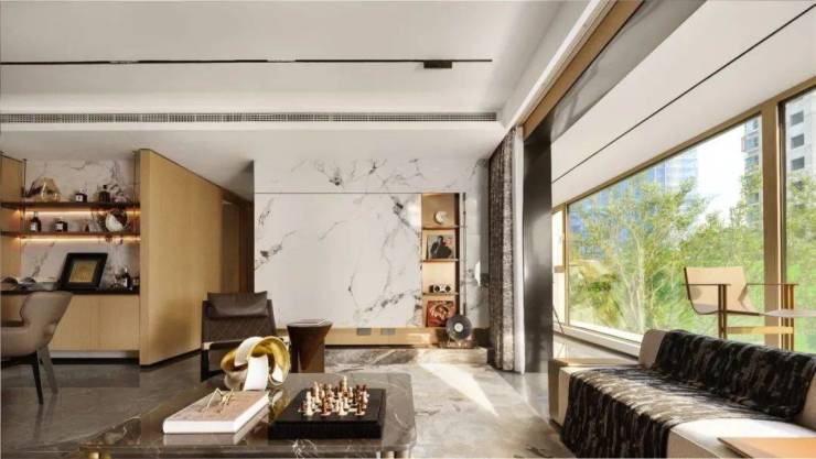 大理石与香槟金铝板线条勾勒出宽敞舒适的入口空间,地库配备星空顶设计,全屋使用一线高端品牌,构造12大精装细节。