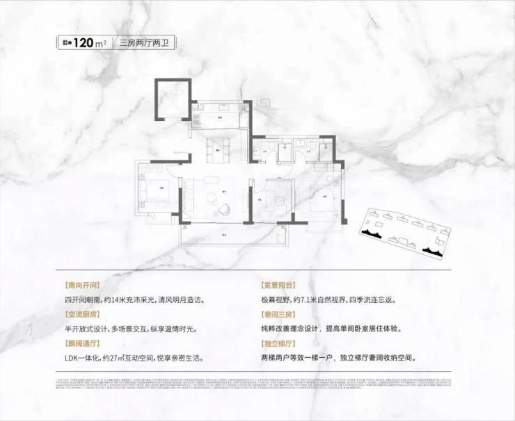 建面约120㎡,3室2厅2卫设计,享受社区头排无遮挡的南向极幕视野,约14米开间、城芯唯一三房全朝南、约7.1米宽境阳台,定义王牌尺度和奢享。