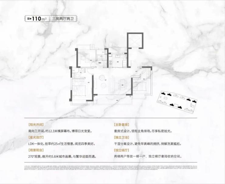 建面约110㎡,3室2厅2卫设计,布局合理,独立入户玄关,进门解放双手,进门看到宽阔的横厅,连通两面宽南向景观阳台,充分吸收阳光。U型厨房设计,动线流畅,主卧套间尺度设计。