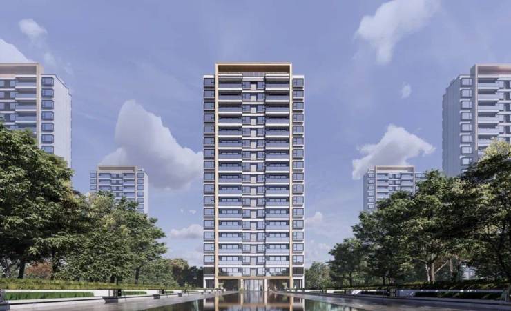 小区建筑风格现代、简约、大气;建筑立面采用金属铝板+玻璃组合,以竖向横向线条交错,保持三段式划分,对称统一;配色以灰色材料作为主要色调,香槟色为辅,营造低调奢华的现代建筑气质。